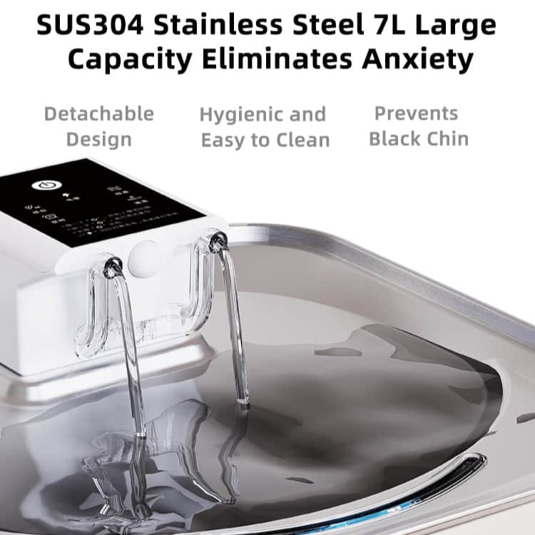 Engineered by Pet Super Factory, the 7L Wireless Stainless Steel Cat Water Fountain is a factory-direct automatic pet water fountain designed for safer, cleaner hydration. This cordless pet water dispenser uses a 5000mAh rechargeable battery for up to 30 days of wireless use, so you can place it anywhere without messy cables. The large 7L SUS304 stainless steel tank is hygienic, scratch-resistant and ideal for multi-cat homes or small dogs. Multi-stage filtration, an ultra-quiet pump and smart anti-dry-burning protection keep water fresh and flowing while protecting the motor. With its easy-to-clean, quick-release structure, this stainless steel pet water fountain delivers reliable, low-maintenance hydration for modern pet families and brands.